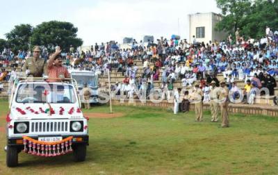 Photo Caption : Minister SA Ramdas seen inspecting a parade during 65th Independence Day celebration at Chamundi Vihar Stadium, in Mysore on Monday 15th August 2011