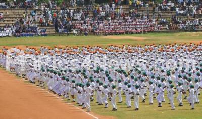 Photo Caption : School children performing during 65th Independence Day celebration at Chamundi Vihar Stadium, in Mysore on Monday 15th August 2011