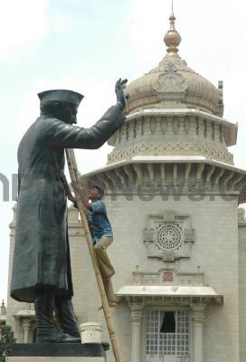 Photo Caption : Workers cleaning Jawaharlal Nehru Statue for tomorrow’s Gandhi Jayanthi at Vidhana Soudha