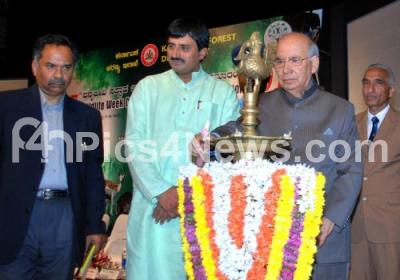 Photo Caption : Governor HR Bhardwaj lighting the lamp to inaugurate 57th Wild Life Week Celebrations Valedictory Function at Chowdaiah Memorial Hall organised by Karnataka Forest Department also seen Forest Minister CP Yogeshwar and others, in Bangalore on Monday 10th October 2011