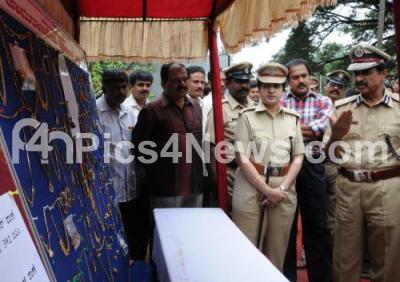 Photo Caption : Police Commissioner Jyothi Prakash Mirji with DCP Priya Narang and senior police officers seen inspecting recovered jewelry and other valuables items which were displayed during recovered property parade at press conference at Jayanagar, in Bangalore on Saturday 5th November 2011