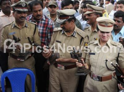 Photo Caption : Police Commissioner Jyothi Prakash Mirji with Additional Commissioner Sunil Kumar, DCP Priya Narang and senior police officers seen inspecting recovered ancient idols which were displayed during recovered property parade at press conference at Jayanagar, in Bangalore on Saturday 5th November 2011
