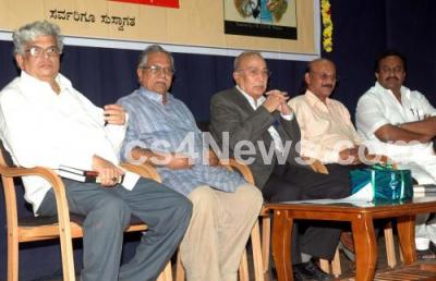 Photo Caption : Former Justice AJ Sadashiva with Dr KE Radhakrishna, renowned poet & MLC Dr Doddarangegowda, Lecturer LN Mukundaraj and others seen during the release of "Voice of the Age", a book of collection of socialist poems by Dr Doddarangegowda organised by Sahitya Suggi at Kannada Sahithya Parishat, in Bangalore on Wednesday 16th November 2011