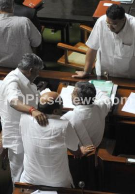 Photo Caption : Opposition Leader Siddaramaiah and JDS Opposition Leader in Assembly HD Revanna and other MLAs seen during Assembly Session in Vidhana Soudha, in Bangalore on Thursday 8th December 2011