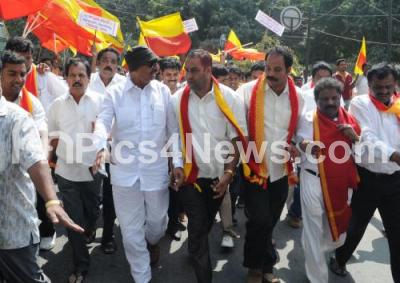Photo Caption : Members of pro Kannada associations led by Vatal Nagaraj, Sara Govind and others seen participating in a protest rally to Raj Bhavan demanding to make Belgaum Corporation as super seed and protest against Shivsena chief Bal Thackeray, in Bangalore on Thursday 8th December 2011