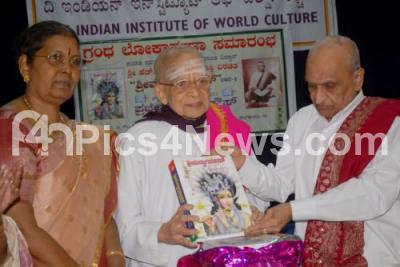 Photo Caption : Vidwan N Rangatanata Sharma, Prof TS Krishnamurthy and MLC Dr SR Leela at the release of "Madgavatam" book at Indian Institute of World Culture, in Bangalore on Sunday 1st January 2012