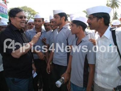 Photo Caption : Former Lokayukta Justice N Santhosh Hegde seen interacting with Members of Jagruthi Vidyarthi Vedike from Honnali Taluk of Davangere District during their protest in support of Lokayukta and Jan Lokpal, protest held at Freedom Park, in Bangalore on Monday 2nd January 2012