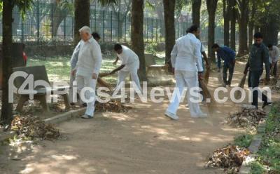 Photo Caption : Members of the Bangalore City Youth Congress led by former Mayor Ramachadrappa seen cleaning up the garbage at Cubbon Park during a City clean up drive from Bangalore City Congress, in Bangalore on Monday 2nd January 2012