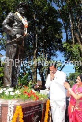 Photo Caption : Chief Minister DV Sadananda Gowda and his wife Datty Sadananda Gowda offering floral tribute to the statue of Field Marshal Cariappa during his visit to Madikeri on Monday 2nd January 2012