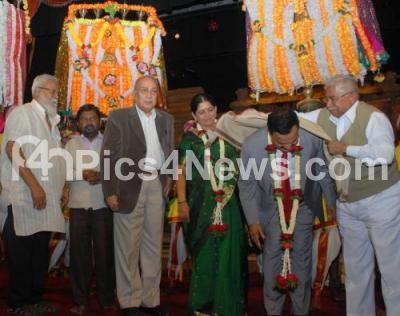 Photo Caption : IM Vittala Murthy, Principal Secretary of Medical Education being felicitated by Jnanapeetha Awardee Dr Chandrashehara Kambara during a cultural art camp at Ravindra Kalakshetra organised by Samskruthi Sangaathi also seen Dr Siddalingaiah, President, Kannada Books Authority, Justice AJ Sadashiva and others, in Bangalore on Monday 2nd January 2012