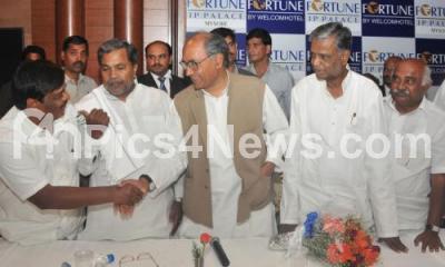 Photo Caption : Senior Congress leader Digvijay Singh being greeted by Opposition Leader Siddaramaiah and other congress leaders at JP Palace Hotel during his visit to Mysore on Tuesday 3rd January 2012