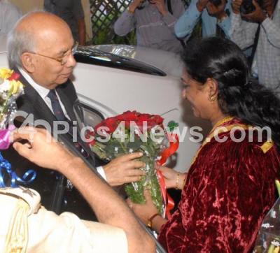 Event Description : Governor HR Bharadwaj being greeted by Mysore City Mayor Pushpalatha Chikkanna during his visit to Mysore City, in Mysore on Wednesday 4th January 2012