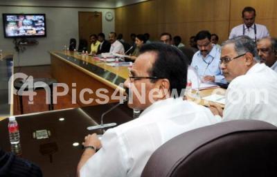 Photo Caption : Chief Minister DV Sadananda Gowda seen discussing with Deputy Commissioners & Chief Executive Officers of the districts via Video Conferencing at Vidhana Soudha also seen Minister S Suresh Kumar and others, in Bangalore on Friday 6th January 2012