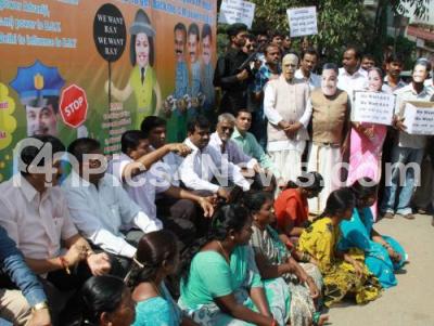 Photo Caption : Members of City Youth Congress protesting by wearing masks of BJP leaders against BJP Govt, Yediyurappa’s supporter MLAs, protest held at Gandhi Statue Anand Rao Circle, in Bangalore on Friday 6th January 2012