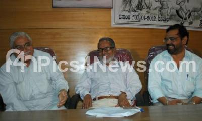 Photo Caption : Jnanapeetha Awardee Dr Chandrashekhara Kambara with literature Dr K Marulasiddappa and film Director NS Shankar seen during a seminar programme on Dyavanur at Gandhi Bhavan organised by Grama Bharatha Samskruthika Vedike, in Bangalore on Saturday 7th January 2012