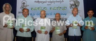 Karnataka Ratna Nadoja Dr De Javaregowda with Writer Dr Pulali Vasanth Kumar, Nadoja Dr Hampana and Dr CP Krishna Kumar and others seen releasing the writer Belur Ragnandan's "Kavishailada Kavitegalu" books at Kannada Sahithya Parishat, in Bangalore on Sunday 8th January 2012