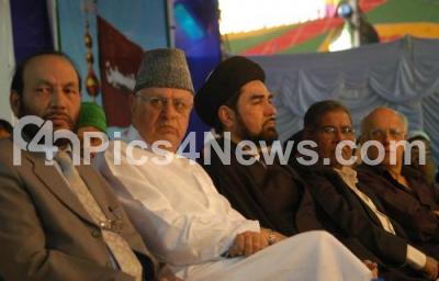 Photo Caption : Union Minister Dr Farooq Abdullah with Film Maker Mahesh Bhat, Dr K Rahman Khan, Deputy Chairman of Rajya Sabha, Hujjatul Islam Moulana Syed Kalbe Jawad and others seen during "Yaum e Husain" (Husain Day) celebration programme at Shia Aramgah, Hosur Road, in Bangalore on Sunday 8th January 2012