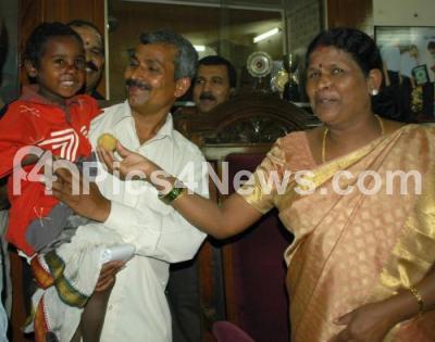 Photo Caption : Mayor Sharadamma offering sweets to 5 year old Selva who was attacked by stray dogs yesterday at Ashtalakshmi Layout of JP Nagar, Congress leaders and workers along with the injured boy presented a memorandum to Mayor Sharadamma requesting for financial relief for the victim’s family at BBMP Office, in Bangalore on Monday 9th January 2012