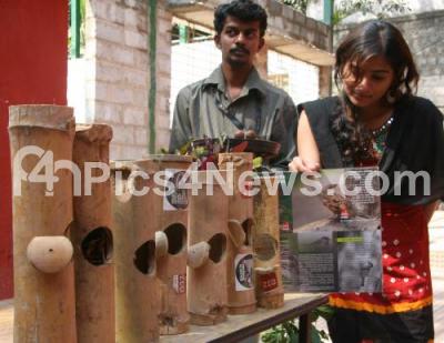 Photo Caption : Gubbi Goodu (sparrow houses) being arranged during a press conference on “ZED Ecofestâ€Â, India’s first ever eco festival organised by ZED Habitats and Biodiversity Conservation India at Press Club, in Bangalore on Wednesday 11th January 2012