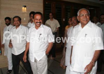 Photo Caption : Chief Minister DV Sadananda Gowda with Former Chief Minister B S Yediyurappa, BJP State President KS Eshwarappa, Minister Jagadeesh Shetter others seen after a meeting with RSS leaders at RMV II stage, in Bangalore on Wednesday 11th January 2012