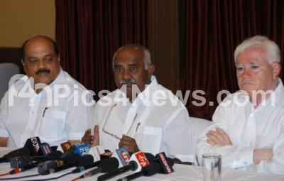 Photo Caption : Mysore MP H Vishwanath of Congress with Former Bangalore Mayor Ramachandrappa and others seen addressing during a press conference at Hotel Parag, in Bangalore on Thursday 12th January 2012