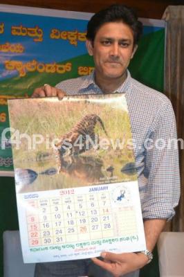 Photo Caption : Cricketer Anil Kumble seen releasing calendars and pocket calendars for the year 2012 at Aranya Bhavan organised by Karnataka State Forest Dept Drivers Association, in Bangalore on Thursday 12th January 2012