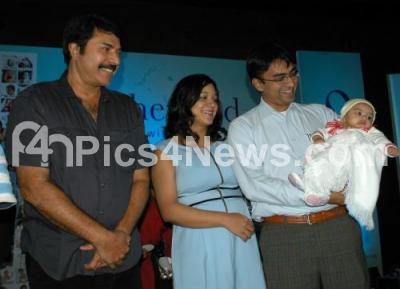 Photo Caption : Actor Mammootty seen with a couple with their child during a programme to celebrate 1st anniversary of Motherhood, a boutique birthing centre by Rhea Healthcare Pvt Ltd, in Bangalore on Thursday 12th January 2012