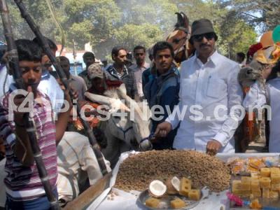 Event Description : Members of Kannada Chaluvalu Vatal Paksha led by Vatal Nagaraj celebrating Sankranti festival with domestic animals at SBM Circle, in Bangalore on 15th of Jan 2012