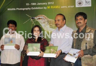 Photo Caption : Actress Pooja Gandhi, Ramu M, KR Srinivas, MD, BMTC and B Srinivasa, MFIAP, releasing the "Wild Frames 2012" calendar during wildlife photography exhibition of Ramu M at Chitra Kala Parishath, in Bangalore on 15th of Jan 2012