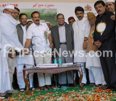 Photo Caption : CM DV Sadananda Gowda inaugurated the foundation stone laying ceremony of Haj Ghar in the presence of K Rehman Khan, R Ashok, Home Minister, Zameer Ahmed, MLA, Moulana Asharaf Ali Saheb, Krishna Byregowda, DB Chandregowda, Jaffer Sharief and others at Tirumenahalli Village, Hegde Nagar, Kogilu road, Yelahanka Hobli, in Bangalore on Sunday 15th January 2012