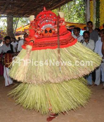 Photo Caption : Bootharadane is being performed by an artist during Chief Minister DV Sadananda Gowda’s visit to Devaragowda at Sulya Taluk in Dakshina Kannada, Bootharadane is unique form of traditional, ritualistic folk dance performed in coastal parts of Karnataka attracting many people on Tuesday 17th January 2012