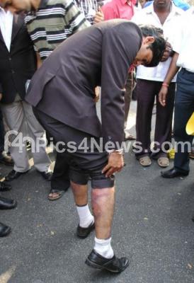 Photo Caption : An advocate who was assaulted by police seen showing off his injuries during Advocates protest and road blockade on KG Road near SBM Circle during their protest against assault by police on an advocate, in Bangalore on Tuesday 17th January 2012