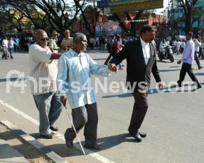 An advocate seen helping blind people to cross the road during Advocates protest and road blockade on KG Road near SBM Circle during their protest against assault by police on an advocate, in Bangalore on Tuesday 17th January 2012