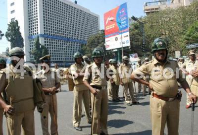 Photo Caption : Police security seen during lawyers protest rally from SBM Circle to Raj Bhavan protesting against police, in Bangalore on Thursday 19th January 2012