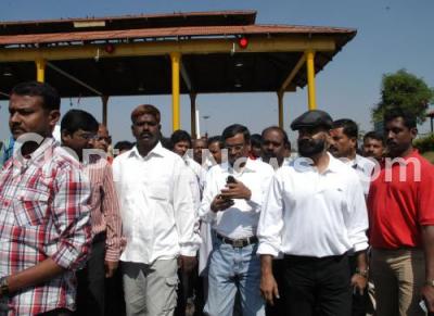 Photo Caption : Members of Kannada Sene led by Agni Shridhar seen protesting against collection of toll gate fee on Nice Road near Kengeri, in Bangalore on Thursday 19th January 2012