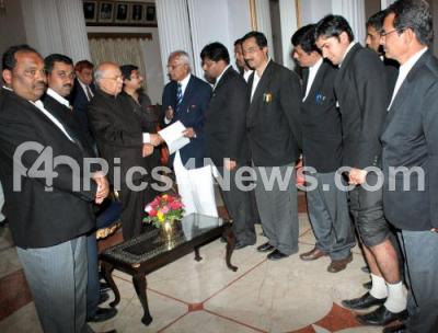 Photo Caption : KN Subba Reddy, President of Advocates Association along with secretaries and members of Advocates Association seen presenting a memorandum to Governor HR Bhardwaj at Raj Bhavan about ongoing protests against police, in Bangalore on Thursday 19th January 2012