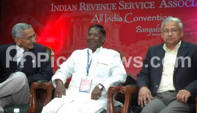 Photo Caption : V Narayanasamy, Union Minister of State of Parliamentary Affairs, PMO, Personnel, Public Grievances & Pensions seen with SS Rana, IRS, Member, CBDT and SP Swain, IRS, President, IRS Association during All India Convention of Indian Revenue Service Association at Cauvery Hall, CR Building, in Bangalore on Friday 20th January 2012