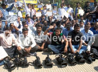 Photo Caption : Journalists and members of print and electronic media seen protesting against lawyers for manhandling and abusing media personnel in the recent protest by the lawyers, protest held at MG Road Gandhi Statue, in Bangalore on Saturday 21st January 2012