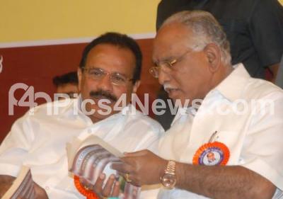Photo Caption : Chief Minister DV Sadananda Gowda seen interacting with Former Chief Minister BS Yediyurappa during book release programme of “Ambedkar – The Making of Indian Constitution†book written by Dr HV Hande (former Tamilnadu Health Minister), at Ravindra Kalakshetra organized by Sapna Book House, in Bangalore on Monday 23rd January 2012