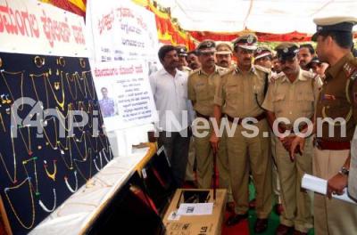 Photo Caption : Police Commissioner Jyothi Prakash Mirji with Additional Commissioner of Police Sunil Kumar and other officers seen inspecting recovered jewellery which were displayed during a recovered property parade at HAL Police station, in Bangalore on Monday 23rd January 2012