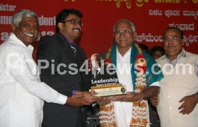 Photo Caption : Former Chief Minister BS Yediyurappa being felicitated by members of Bangalore Institute of Management Studies during a national seminar programme on "Leadership" and an interaction programme with management students of BIMS at Kengeri organised by Bangalore Institute of Management Studies (BIMS), in Bangalore on Monday 23rd January 2012