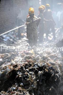 Photo Caption : Fire personnel seen trying to doze off the fire at a plastic factory gowdown after fire caught in the gowdown on Mysore Road, in Bangalore on Monday 23rd January 2012
