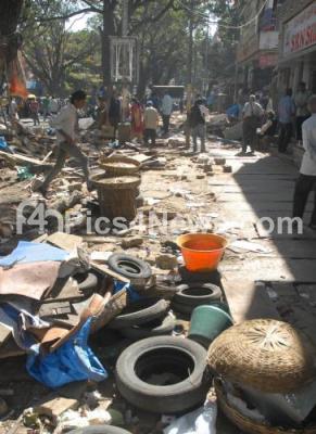 Photo Caption : BBMP demolished illegally constructed shops on footpath at Gandhi Bazaar in Basavanagudi yesterday night during a demolition drive by BBMP, in Bangalore on Tuesday 24th January 2012