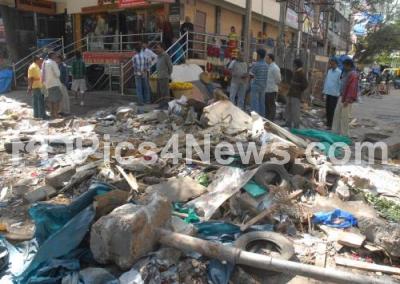 Photo Caption : BBMP demolished illegally constructed shops on footpath at Gandhi Bazaar in Basavanagudi yesterday night during a demolition drive by BBMP, in Bangalore on Tuesday 24th January 2012