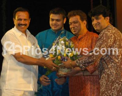 Photo Caption : Musicians Ustad Hafiz Khan, Ustad Chote Rahmath and Mihir Kallianpur being greeted by Chief Minister DV Sadananda Gowda after their performance at Republic Day Cultural programmes at Ravindra Kalakshetra on the occasion of 63rd Republic Day celebration organised by Kannada and Culture Dept, in Bangalore on Thursday 26th January 2012