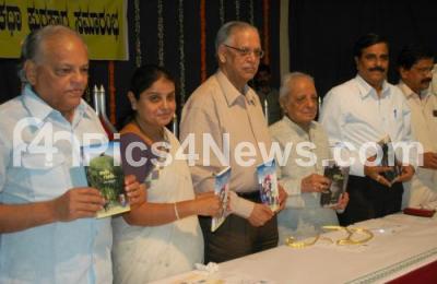 Photo Caption : Prof LS Sheshagiri Rao, Manu Baligar, Commissioner Kannada and Culture Dept, Dr MS Asha Devi, Poet BR Lakshman Rao and others seen releasing Masti awards books during Masti Awards presentation ceremony organised by Dr Masti Venkatesh Iyengar Trust at Hotel Woodlands, in Bangalore on Friday 27th January 2012