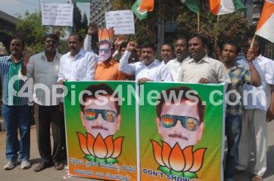 Photo Caption : Members of Bangalore City District Congress Committee seen protesting against Speaker KG Bopaiah, protest held at Gandhi Statue Anand Rao Circle, in Bangalore on Saturday 28th January 2012