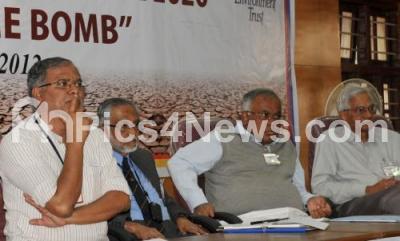 Photo Caption : Minister S Suresh Kumar with Former Minister and JDS Leader PGR Sindhiya, V Balasubramaniam, Chairman, Centre for Policies & Practices and others seen during one day conference on Bangalore's Water Famine by 2020: A Ticking Time Bomb, a conference on impending water crisis of Bangalore at Gandhi Bhavan organised by Centre for Policies and Practices, in Bangalore on Sunday 29th January 2012