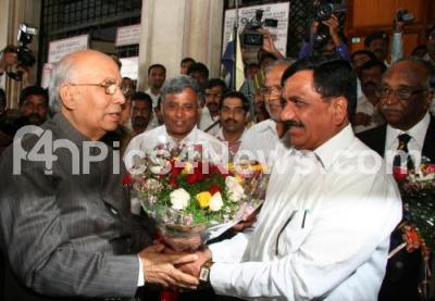 Photo Caption : Governor HR Bhardwaj being welcomed by Assembly Speaker KG Bopaiah for Joint Session of Legislation at Vidhana Soudha also seen Ministers S Suresh Kumar, V Somanna and Council Chairman DH Shankar Murthy, in Bangalore on Monday 30th January 2012