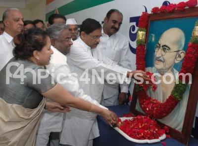 Photo Caption : KPCC President Dr G Parameshwar with other Congress leader Rani Satish, Corporator Udayshankar and others offering floral tribute to the photo of Mahatma Gandhi to mark the Martyrs Day and Sarvodaya day at KPCC, in Bangalore on Monday 30th January 2012